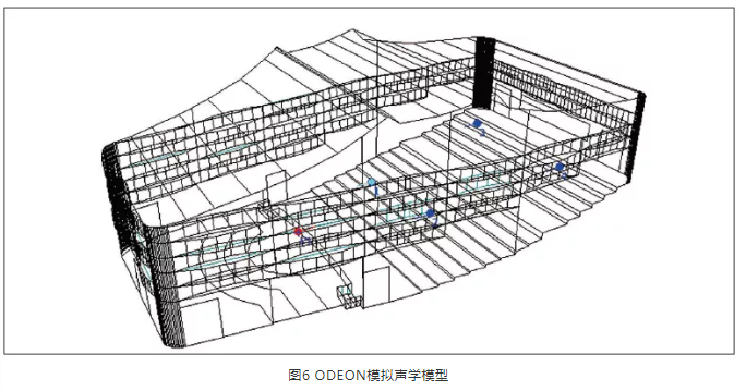 為驗證聲學設計的合理性與科學性,對音樂廳進行三維建模與音質(zhì)模擬(圖6),通過仿真計算,預測廳內(nèi)各項音質(zhì)指標是否滿足設計要求。此外,為進一步將音質(zhì)指標“可聽化”,在設計過程中,將仿真計算得到的脈沖響應與消聲室內(nèi)錄制得到的音頻信號進行卷積,預制音樂廳建成后的音頻信號,然后借助多聲道還聲系統(tǒng)建立“虛擬聲場”,讓聽者在音樂廳建成之前切身感受其音質(zhì)效果。本項目利用的是8.1通道還聲系統(tǒng),可基本正確反映直達聲與早期反射聲的方位。