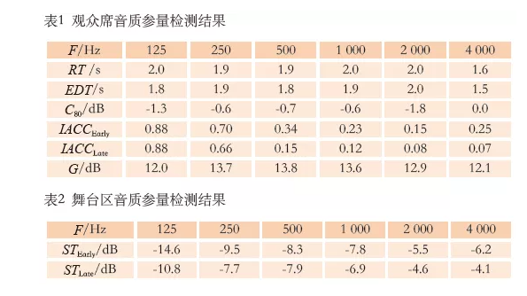 音樂廳竣工后,設計團隊對音樂廳進行聲學檢測[3](空場狀態(tài))。廳內(nèi)主要音質(zhì)指標測量結(jié)果如表1所示。